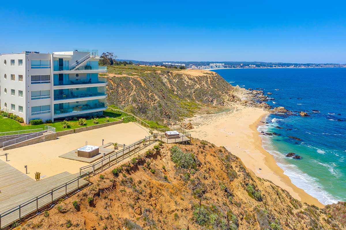 Rodeado de un hermoso ambiente natural, ubicado en primera línea frente al mar, a pasos de la playa El Cura, con acceso privado a esta, y una vista privilegiada a la bahía de Algarrobo.
